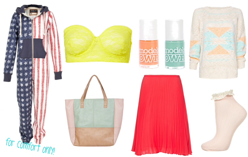 A mixed bag this weekend! I popped to Milton Keynes today and thought I’d share a few things that caught my eye. I saw so many lovely bits in Republic including some lovely asymmetric style dresses, all reasonably priced too. I made a beeline for this onesie haha how awesome is it? I would have bought it if it wasn’t £50! I couldn’t justify that for just sitting watching films so I’ll stick to my Primark bunny one, hmmmph. I think the pastel shopper is a steal at £22, I’m a bit of a bag snob but I do really like this one and would be handy when carrying more things around! Having a bit of a love affair with Mango at the moment I think they’ve really upped their game and the prices seem to have lowered too. The bra reminds me of Carrie Bradshaw and I can imagine wearing it with a maxi skirt peeping out from a shirt!