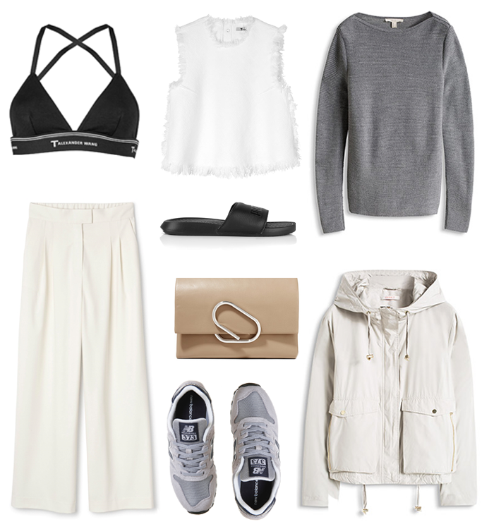 T By Alexander Wang Bra / T By Alexander Wang Frayed Crop Top / Esprit Grey Knit / Weekday Cream Trousers / Phillip Lim Clutch / Esprit Cream Jacket / New Balance Trainers